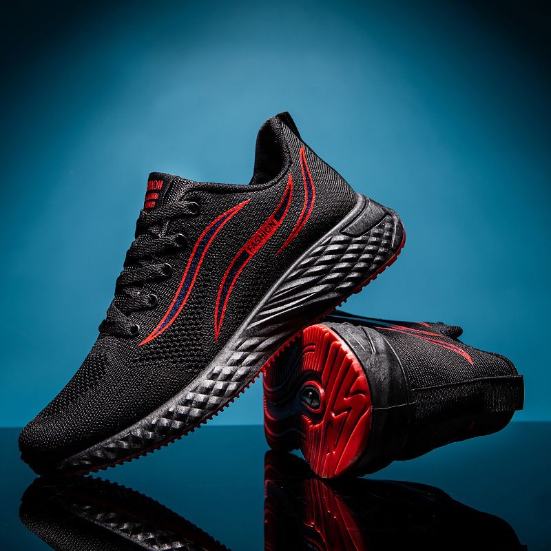 【透氣防滑】針織圓頭繫帶男士運動鞋【黑紅色】一雙